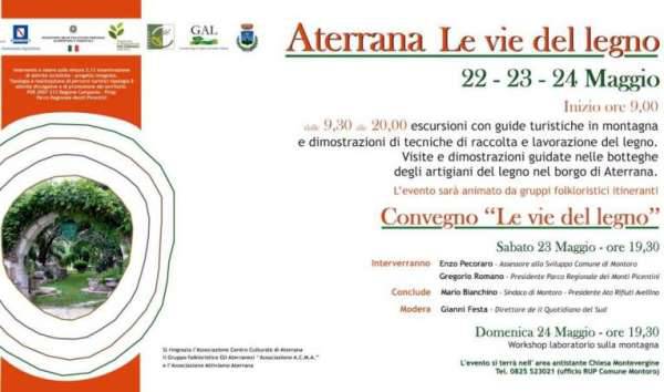 Un affascinante viaggio alla scoperta dell’arte del legno nel borgo storico di Aterrana di Montoro(Avellino) con percorsi turisticidimostrazioni pratiche e workshop. Nei giorni 22, 23, e 24 maggio, il piccolo e suggestivo centro dell’avellinese, situato nel cuore dell’Irpinia, farà da cornice all’eventoculturale intitolato “Le vie del legno”, una tre giorni dedicata alla valorizzazione delle tipicità e tradizioni del territorioLa manifestazione, promossa dal Comune di Montoro e realizzata nell’ambito del Programma di Sviluppo Rurale PSR CAMPANIA 2007/2013 per promuovere il turismo locale, prenderà il via venerdì 22 maggio nell’area antistante la Chiesa di Montevergine.Dalle ore 9,30 alle 20, i visitatori, accompagnati da guide turistiche, avranno la possibilità di effettuare escursioni in montagna e raggiungere punti di grande interesse naturalistico e paesaggistico. Inoltre, ripercorrendo i piccoli vicoli e le stradine che s’inerpicano nel centro storico, potranno visitare le botteghe degli artigiani dell’antico borgo di Aterrana e assistere a dimostrazioni di tecniche di raccolta e lavorazione del legno. Nel corso dell’evento si esibiranno gruppi folkloristici itineranti, che animeranno e coloreranno le strade del centro irpino con canti e balli.