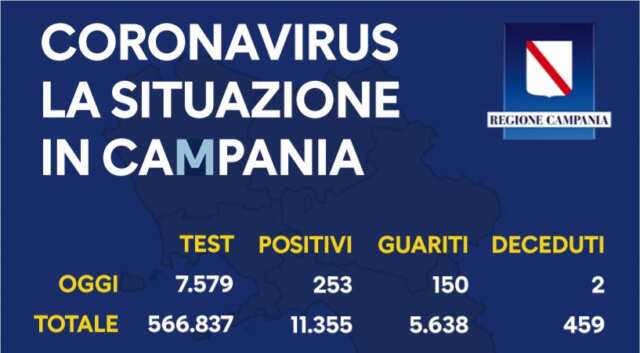 Dall’unita’ di crisi della Regione Campania arriva l’aggiornamento di oggi 25 settembre che parla di 253 nuovi positivi su 7.579 tamponi. Il totale dei positivi in Campania sale a 11.355 su 566.837 test; i guariti del giorno sono 150 su un totale di 5.638 ed i deceduti due su un totale di 459.
