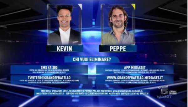 LE NOMINATION A COPPIA – Ogni coppia deve nominarne altre due, assegnando due voti a quella meno gradita e uno all’altra. Le squadre che ricevono più voti devono accordarsi su chi mandare al televoto. I nominat sono Peppe-Luigi e Mary-Kevin, che hanno scelto di schierare rispettivamente Peppe e Kevin.