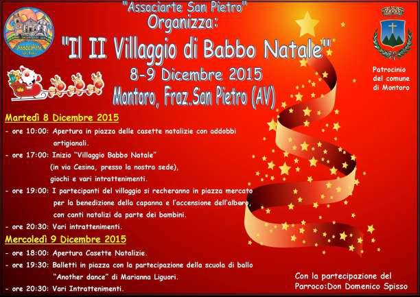 E’ tutto pronto alla frazione San Pietro di Montoro per “il Villaggio di Babbo Natale”, la manifestazione natalizia organizzata dall’ “Associarte San Pietro”, con il patrocinio del Comune di Montoro. A partire dalle ore 10 di domani ci sarà, presso la piazza principale della frazione, l’apertura delle casette natalizie con addobbi artiginali. Alle ore 17, invece, è prevista l’apertura del Villaggio di Babbo Natale, presso la sede dell’Associazione, in via Cesina. L’evento proseguirà con la benedizione in piazza mercato e l’accensione dell’albero di Natale, che resterà in piazza fino al 10 gennaio 2016.