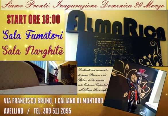 Domenica 29 marzo 2015 alle ore 18,00 si inaugura all’ Almarica Cafè di Montoro la nuova e innovativa sala Narghilè. Situato nella frazione Caliano del comune montorese in provincia di Avellino, l’ Almarica cafè èun punto di ritrovo alternativo e conviviale, diventato nel tempo un punto di riferimento per tanti giovani montoresi e della valle dell’Irno. Da sempre l’Almarica cafè di Gianfranco e Nadia, ha sempre puntato sull’accoglienza e la creatività imprenditoriale giovane e dinamica, incui puoi trovare buona musica. Per l’occasione la sala sala fumatori all’ esterno del locale, sarà inaugurata con una grande festa aperta a tutti. Lo start è alle ore 18:00 con la degustazione di vini tipici, accompagnati da taglieri di salumi, il tutto in un ambiente moderno e accogliente.