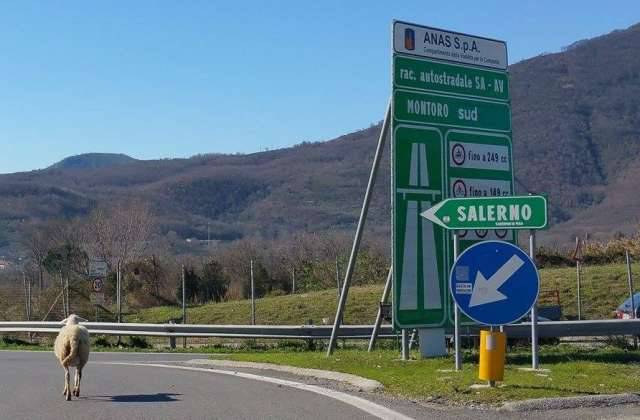 Montoro – Si potrebbe pensare ad un fotomontaggio. Invece la foto è vera. Sicuramente qualche automobilista oltre Gerardo, amministratore della pagina Facebook “Benvenuti a Montoro”, avrà notato un curioso e simpatico episodio. Pochi minuti fa, una pecora, smarritasi dal proprio gregge, ha imboccato, naturalmente per sbaglio, il raccordo autostradale Avellino-Salerno, proprio in direzione Salerno. Naturalmente tutti penseranno subito al collegamento calcistico, con i tifosi granata e quelli irpini che fino ad un mese fa si sono scambiati reciprocamente sfottò per via del derby tra le opposte fazioni. La pecora, però, per fortuna (diranno i tifosi irpini), si è subito resa conto del clamoroso “errore” e dopo aver percorso la rampa di immissione, ha preferito rientrare in terra montorese attraverso i terreni adiacenti all’autostrada.