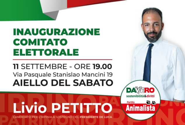Domani, 11 settembre, alle ore 19, presso il comune di Aiello del Sabato, in via Mancini 19, sarà inaugurato il Comitato Elettorale della lista Davvero,  in sostegno del candidato governatore Vincenzo De Luca. All’evento saranno presenti i quattro candidati Irpini al consiglio regionale della Campania: Livio Petitto, Agnese Vietri, Maria Donatiello e Gabriele Buonanno. La serata vedrà gli interventi dell’On. Angelo D’Agostino e del Sindaco della città di Avellino, Gianluca Festa. L’appuntamento, come accade da qualche mese, si svolgerà nel pieno rispetto delle normative anti-COVID.