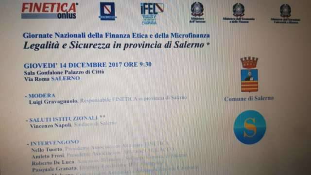 Il giorno 14 dicembre si svolgerà, presso la Sala Gonfalone del Palazzo di Città a Salerno, il convegno su “Legalità e la Sicurezza” organizzato da Finetica Onlus e patrocinato da Regione Campania, IFEL Campania e dai Ministeri dell’Interno, Economia e Finanza, Istruzione Università e Ricerca.