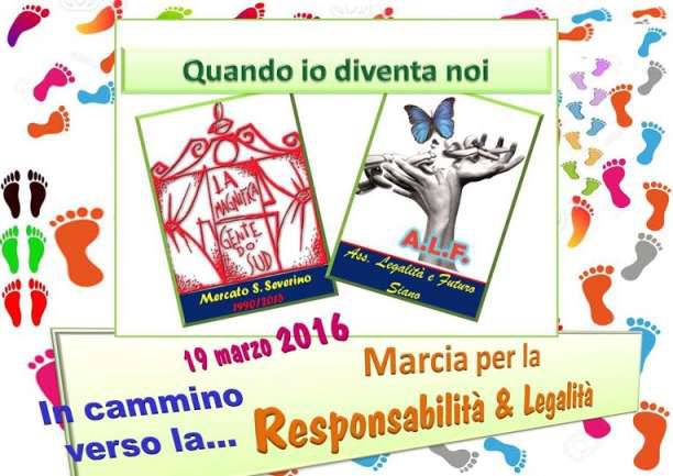 Marcia per la Responsabilità & Legalità, sabato 19 marzo 2016a Siano , con partenza da piazza Paolo Borsellino alle 18’30, alla sua V^ edizione è ormai diventata un appuntamento fisso e contemporaneamente la degna conclusione di un percorso che è partito il giorno dopo la conclusione di quella del 2015. Partita nel 2011 come marcia per la Legalità, organizzata dall’associazione Legalità e Futuro, mano a mano si è evoluta negli anni attraverso nuovi incontri e condivisioni, soprattutto con l’associazione La magnifica gente do’ sud, con la quale inizia una forte sinergia fino ad unire i propri io per diventare un noi. “Afferra la speranza… illumina la vita”,  è lo slogan con cui si metterà in cammino la marcia, a cui vi hanno aderito, parrocchie-scuole-associazioni-singoli, una marcia per dire no all’indifferenza e proseguire intanto verso la Responsabilità, nel quotidiano, nel difendere il proprio paese, il proprio rione, il proprio marciapiede, incontrandosi e guardandosi negli occhi con le persone comuni, una marcia fatta da noi, “insieme”, per noi, senza chi crede di possedere il diritto di essere depositario di verità … Una marcia fatta di incontri – esperienze – idee – diffusione attraverso il teatro civile/sociale. Insieme, tenendoci per mano con il nostro vicino, percorreremo le strade di Siano ricordando Ivan, giovanissimo componente dell’Associazione Legalità e Futuro, che continuerà a camminare, come ha sempre fatto nella sua breve vita terrena, al nostro fianco sostenendoci e soccorrendoci nei momenti di scoramento. Vi aspettiamo per ultimare il nostro percorso di un intero anno e contemporaneamente ripartire per nuovi obiettivi.
