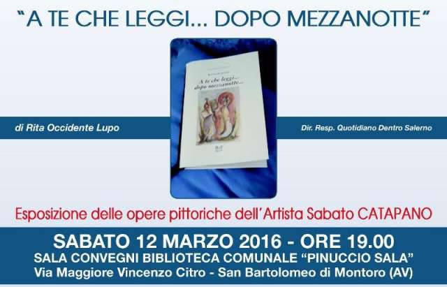 Domani 12 marzo, presso la sala convegni della Biblioteca Comunale “Pinuccio Sala” sarà presentato il libro del Direttore Responsabile del quotidiano Dentro Salerno, Rita Occidente Lupo “A te che leggi dopo mezzanotte”. L’appuntamento è fissato alle ore alle ore 19:00, con i saluti del Sindaco Mario Bianchino, dell’Assessore alla Cultura Raffaele Guariniello, e il seguente intervento di Maria Rosaria Paraggio, presidente commissione Pari Opportunità San Cipriano Picentino e di Tina Cipolletta, Consigliere Comunale della città di Montoro. A presentare l’evento Adelina Caliano. La serata sarà accompagnata musicalmente da Giuseppe Mallardo e corredata dalle opere artistiche di Sabato Catapano. Concluderà l’autrice. Sarà affrontato principalemente il tema dell’emancipazione femminile, alla luce dei costanti femminicidi, rimarcando il ruolo dell’affettività sulla violenza. Il libro, infatti, stigmatizza la solitudine di tante donne, spesso vittime d’incomunicabilità col proprio compagno di vita o relegate alla solitudine del proprio ambiente domestico, laddove non incontrano sintonia con l’ambiente circostante, nel quale spesso devono alzare la guardia attentiva, per evitare che gli strumenti tecnologici e la rete, possano tramutarsi in trappole letali.
